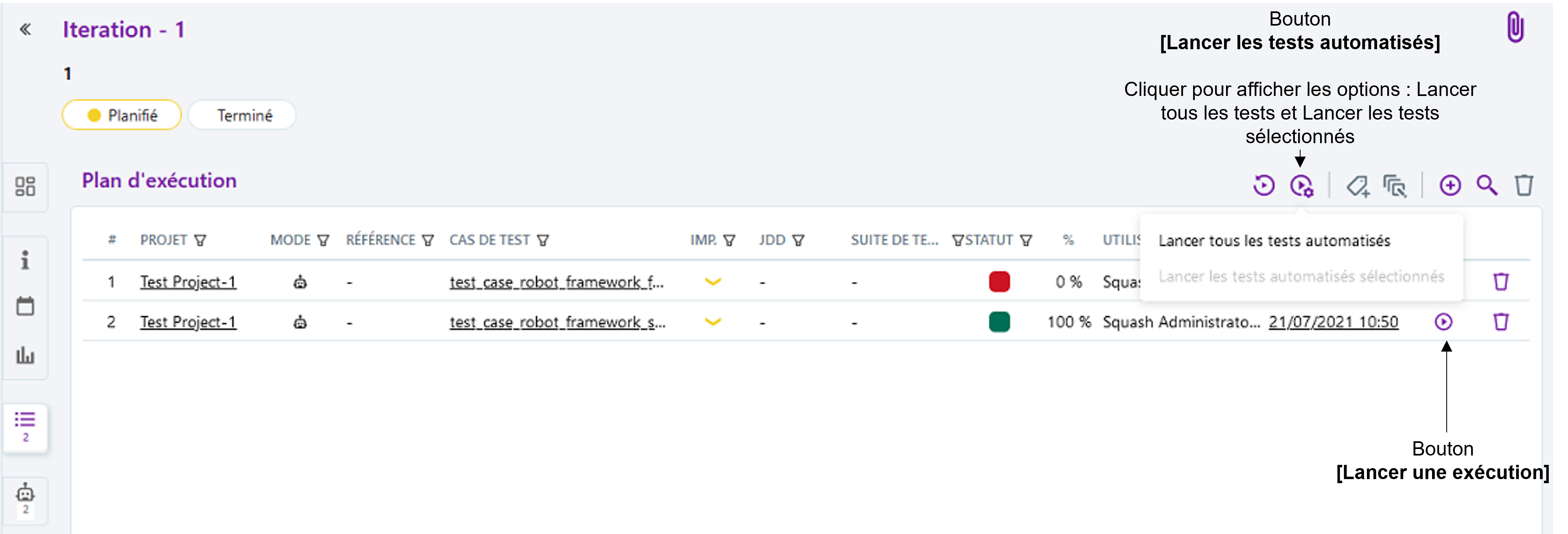 L'exécution d'un plan d'exécution automatisée se déroule de la façon habituelle dans Squash TM :