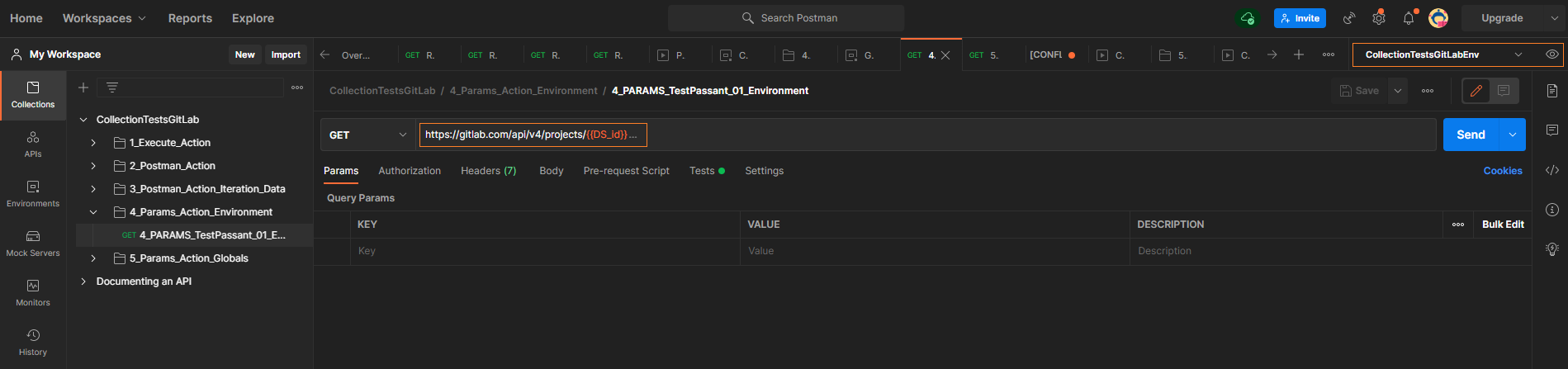 Il est possible lors de l’exécution d’un test Postman d’exploiter des paramètres au sein de celui-ci. Un paramètre peut être un paramètre de test ou un paramètre global. Squash TM ne transmet que des paramètres de test. Des paramètres de test et des paramètres globaux peuvent être utilisés dans Squash DEVOPS avec l'action postman/params.